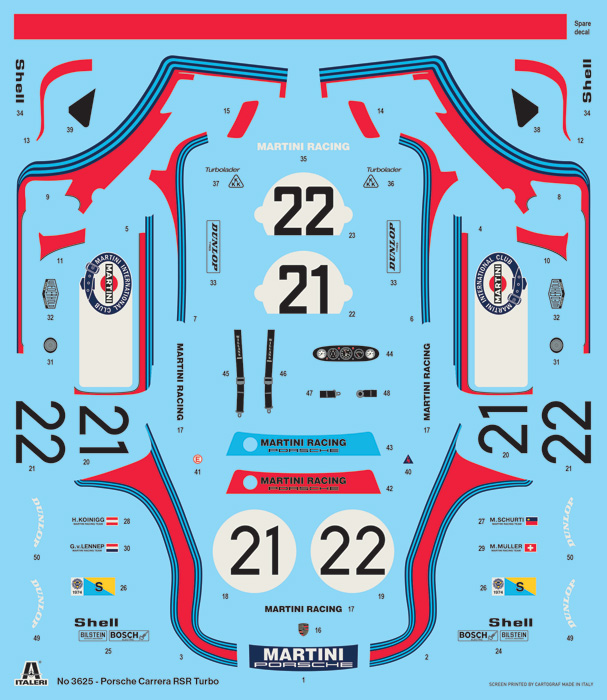 The Porsche 911 Turbo Carrera RSR was built in 1974 in four specimens to take part in the racing season of the World Constructors Championship. Thus it was possible to witness the participation of the factory with one and sometimes two cars under the colors of the Martini Racing Team, and entrusted to the official crews Muller – van Lennep and Koinigg – Schurti. Despite having almost equal power (about 500 hp) to that of rival cars, the Porsches did not have the lightness or handling of the latter, which ran in the Prototype category. However, a fortunate combination of speed and reliability made it possible to achieve respectable results in the nine races on the calendar, including two second places: one at the 24 Hours of Le Mans and one at the 6 Hours of Watkins Glen.